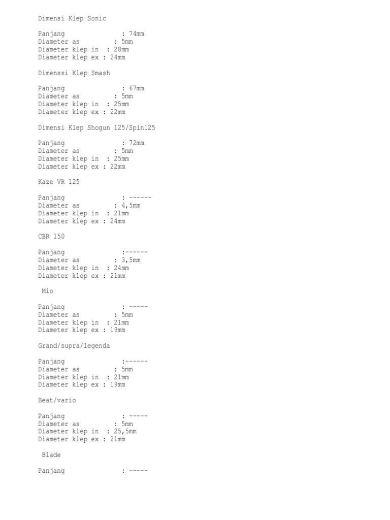67mm Diameter as. 24mm Dimenssi Klep Smash Panjang. 22mm Kaze VR 125 Panjang.