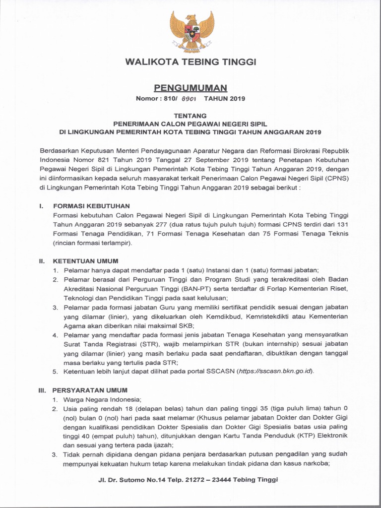 Pengumuman Formasi Cpns 2018 Kota Tebing Tinggi Website Resmi Pemerintah Kota Tebing Tinggi