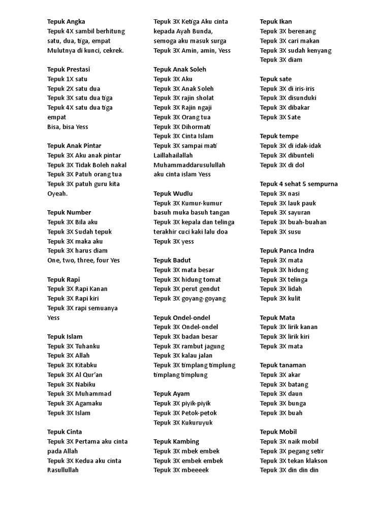 TEPUK ISLAM Tepuk Islam X X X agamamu X X X Islam X X X Tuhanmu X X X Allah X X X Nabimu X X X Muhammad X X X Kitabmu X X X Al Quran X X X temanmu X X X muslim X X X musuhmu X X X syetan 2. Berikut ini adalah kumpulan tepuk anak PAUD jika ingin mendownload bukunya silahkan klik A411 BUKU KUMPULAN TEPUK ANAK PAUD TK KBdocx - 20 KB. Bismillahirrohmaanirrohiim Dengan jalan rahmat dan kasih-Nya Mereka yang beriman mereka yang bertakwa Senantyasa dalam nikmat Allah MACAM-MACAM TEPUK 1.