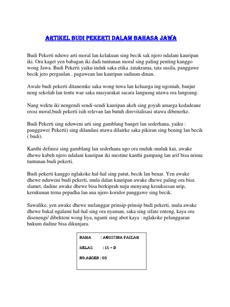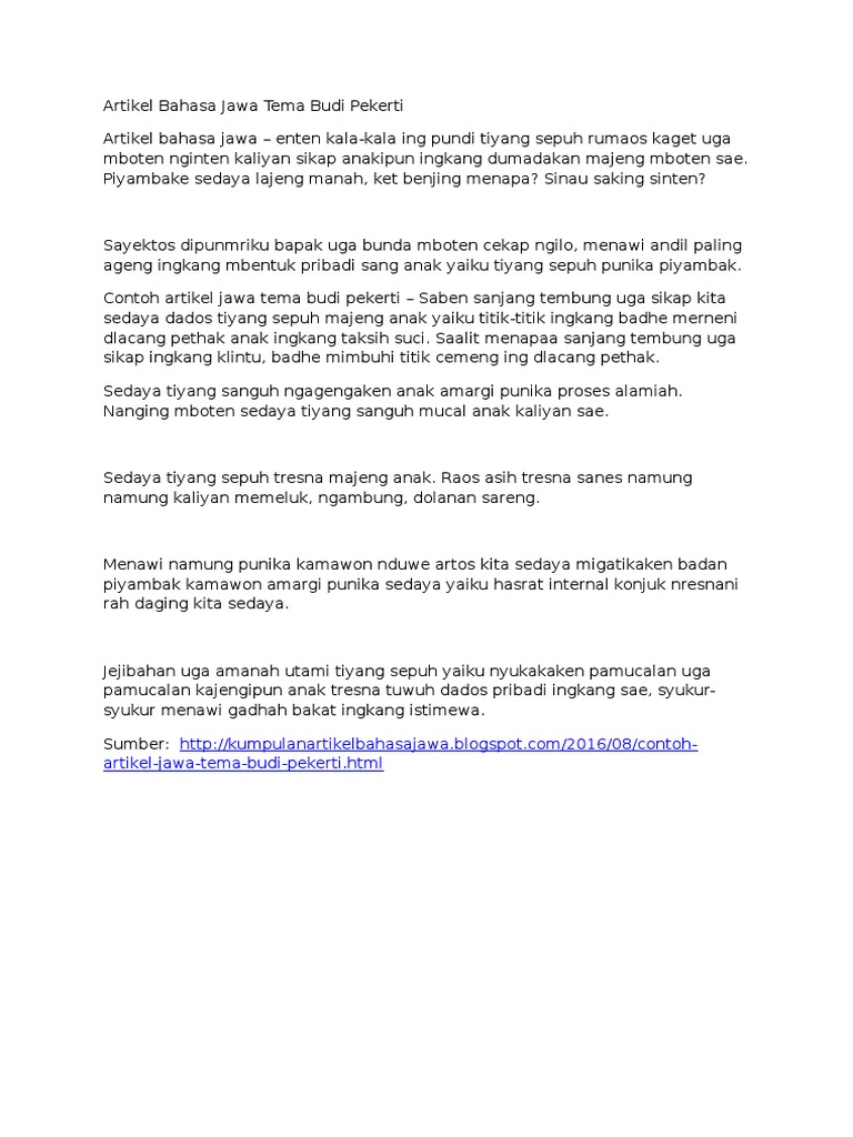 Contoh Artikel Bahasa Jawa Tentang Budi Pekerti Budi pekerti sakudune anyak ditandurke ket masa kanak-kanak becik neng omah arepa neng sekolah banjur mbanjur jero kuripan neng masyarakat. Karakter dados moral utawi akhlak utawi ugi budi pekerti dipunwungu ing inggil kebijakan ingkang sejatosipun mboten namung nggadhahi jarwi nalika dilandasi inggil aos-aos ingkang majeng lebet budaya bangsa. Semono uga ing ngarep omahe Adit.